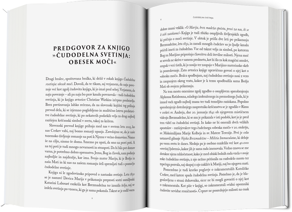 »Z radostjo priporočam knjigo Christine Watkins. Prinaša zgodbe ljudi, ki nosijo čudodelno svetinjo. Med obiskom Pariza sem si ogledal samostan v ulici Rue du Bac, kjer je sveto Katarino Labouré obiskala naša blažena mati in ji naročila, naj si nadene to čudovito svetinjo - sam jo nosim že vrsto let. Prosim, omislite si čudodelno svetinjo, si jo nadenite in uživajte v tej čudoviti knjigi. Naša blažena mati si za vas in zame želi le, da bi njenega sina Jezusa ljubili vsak dan bolj.«/p>